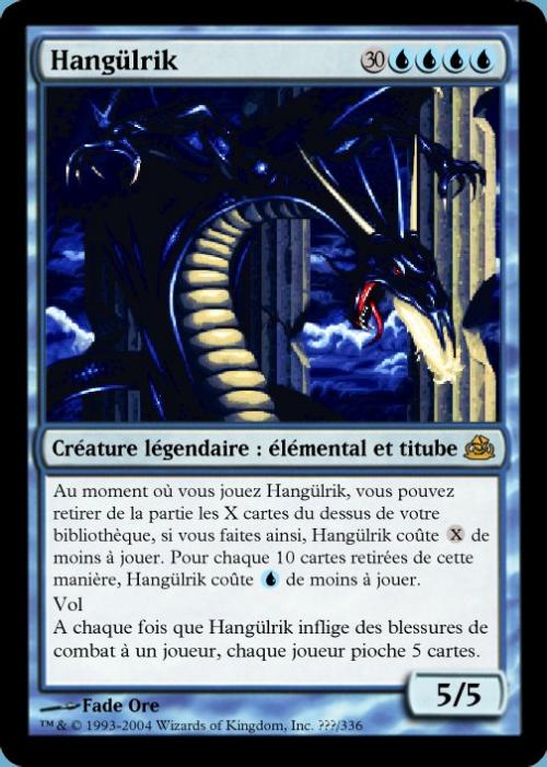 Regardez la premiére capacité, c'est celle qui vous permettra de la jouer sans avoir à mettre plus de 40 terrains dans votre deck, lorsque vous compterez jouer le petit Hangül vous pourrez vous meuler d'autant de carte que vous le souhaitez à la maniére d'un frappeur à l'arc, en faisant ainsi Hangül coûtera 1 de moins pour chaque carte retiré de cette maniére, mais même en faisant ainsi une 5/5 Vol pour 4 mana bleu+un meulage de 30 carte c'est un peu moyen... ainsi pour chaque dixaine de carte meulé on a droit à un bonus de U de moins dans le coût d'Hangül...