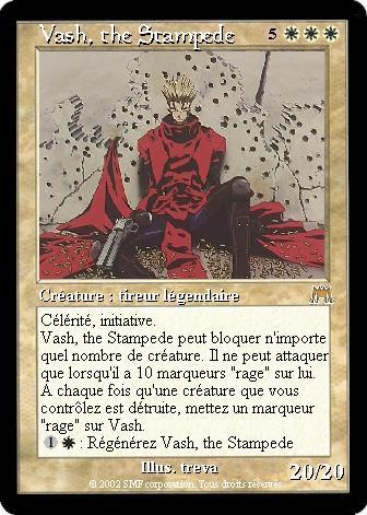 Voilà, je suis enfin de retour!!! dsl j'ai pas pu vous embêter la semaine passée avec mes mangas (problème de connection) Bon, aujourd'hui je m'attaque à trigun. Vash (le héros) est très fort il subit bcp de blessures mais survit tjrs. Il essaye de protéger tout le monde sans tuer personne mais il s'énérve des fois. Avec ça je vous laisse deviner pourquoi j'ai fais cette capa. (le nom en anglais c'est normal il s'appelle comme ça et c'est tout même dans la vf)
