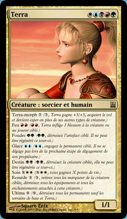 Terra-morph : normalement dans le jeu la capacité s'appelle tout simplement Morph, mais comme la capa existe déjà dans Magic, j'ai mis Terra-morph. Terra est la fille d'un Esper et d'une humaine, et lorsque l'on utilise cette capacité elle prend sa forme d'esper, elle peut voler et ses pouvoirs magique sont beaucoup plus puissants.