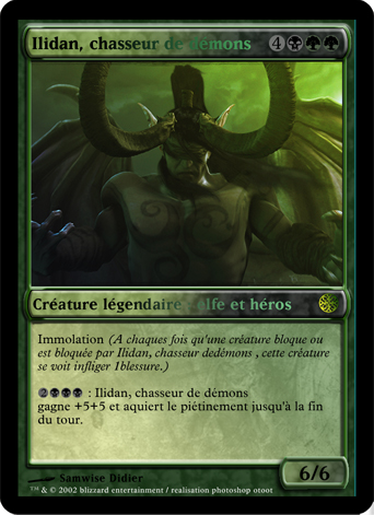 je suis rester assez fidele au jeu , imolation est un sort qui blesse toutes les troupes qui sont au contact direct avec ilidan , donc je l'ai mis a la saveur cartes magic , ensuite l'autre capa ben c le sort ultime de ilidan dans le jeu , métmorphose , il se transforme en demon , devient beaucoup plus fort , donc voila ^^