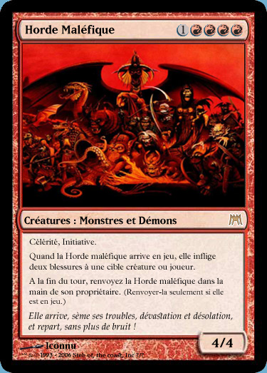 Pour les capacités, (je ne vous parle pas de la célérité ni de l'initiative, mais des 2 suivantes) j'ai voulu faire une carte aggro, puissante mais pas trop. C'est pourquoi, dans un premier temp, elle coutait 1 mana rouge de plus à invoquer mais elle ne possaidait que sa premeire capa (inflige deux blessures). Puis, en faisant une partie avec un collègue, j'ai sorti mon "Pisteur des sables viashino" et j'ai pensé que sa deuxième capa irait bien à la "horde maléfique".