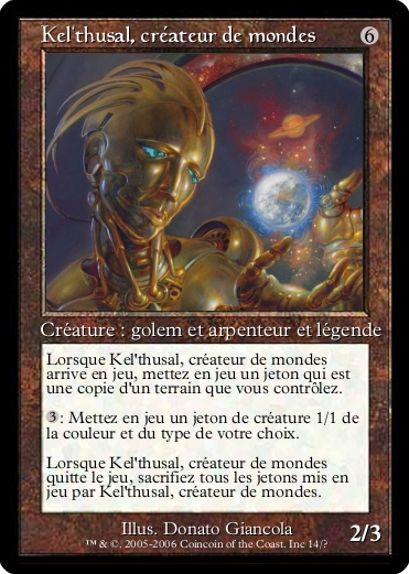 Lorsque Kel'thusal, créateur de mondes arrive en jeu, mettez en jeu un jeton qui est une copie d'un terrain que vous contrôlez.