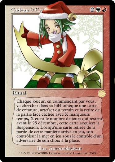 J’ai conçu cette carte avec un concept en tête « comment réussir à combiner une des nouvelles capacités de Time Spiral et une carte sur le principe de Noël ? » Je me suis dit que cela pourrait être un challenge intéressant et je me suis attelé à cette tâche aussitôt.