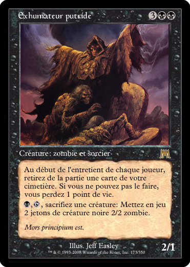 Sa capa consiste à ramener 2 jetons zombies 2/2 pour un modeste mana noir, un TAP ( pour éviter qu'on abuse de son don impie, et un sacrifice - disons pour nourrir les nouvelles recrues ^^)