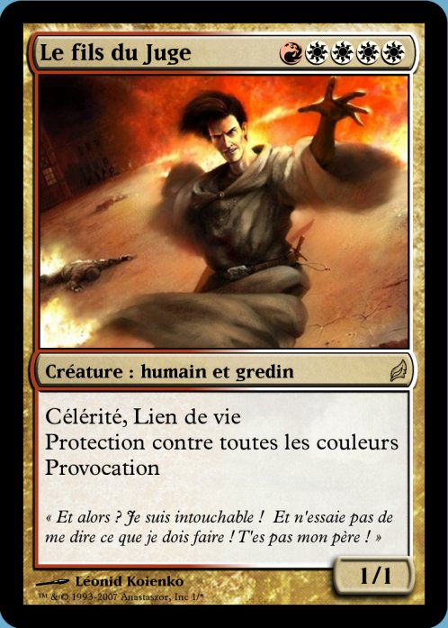 ben pour RWWWW on a une 1/1 imblocable sauf par les artefacts, indestructible (sauf pour les colere de dieu ...) qui devien ingérable si elle est équippée, avec le lien de vie.
