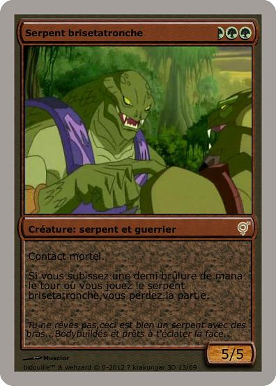 alors,voyons pourquoi...voyons,serpent....ah,oui!la plupart du temps,les serpent sont des créatures avec un mauvais rapport F/E-coût,mais qui ont la capacité d'engager les ennemis qu'ils combattent.