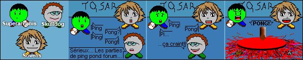 Tiré d'une partie de "ping/pong" sur le convivial, vous savez, ce jeu idiot ou les membres créent un dialogue à base de ping d'un côté et de pong de l'autre... Bref. Scénario de Mandeed. Quand l'humour marche pas, il parait que le gore compense![]()