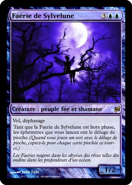 Tant que la Faerie de Sylvelune est hors-phase, les éphémères que vous jouez ont le déluge de pioche.(quand vous jouez un sort avec le déluge de pioche, copiez-le pour chaque sort joué ce tour-ci)