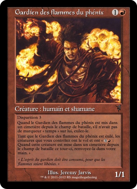 C'est une créature que l'on doit à tout prix exiler, la disparition traduit la "consumation" de l'esprit, si cette consumation c'est faite entièrement l'esprit des flammes (ou du phénix, ou même des flammes du phénix, comme vous voulez, ce qui vous parle le mieux) est libéré, donc exilé (pour moi cimetière, signifie que l'esprit est enfermé et dirigé vers soit le paradis soit l'enfer, il n'est donc pas libre de retourner dans le monde des vivants). Disparition 4, donc 4 tours à survivre si on veut utiliser pleinement le potentielle de cette carte, 3 tours alors que c'est une 1/1, très facile à détruire.