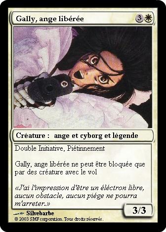bon pour ceux a qui il viendraita l'esprit de me dire beu ton ange pas le vol je repond qu'en fait ANGE c pour son esprit(angelique)et qu'elle est appelée ange tt le lon du manga. En fait Gally est 1 cyborg et ne vol pas mais sa fason de combatre (panzer kunst cf vol1) est un art aérien et oui elle se bat sans toucher le sol la plu par du tant c pas un art ou il faut des appuis de plus sa rapidité a nessecité la double initiative (que j'aimme particulierement)