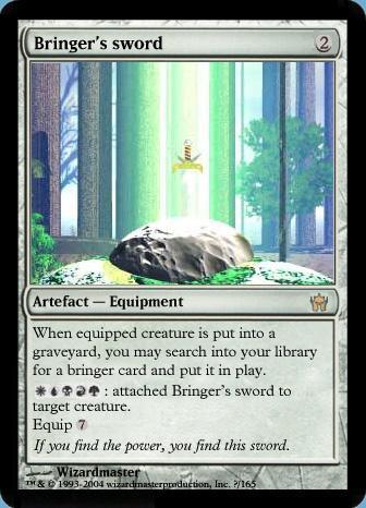bringer's sword : quand la créature équipée est mise dans un cimetière vous pouvez allez chercher dans votre bibliothèque une carte de bringer et la mettre en jeu.WUBRG: attaché bringer's sword à la créature ciblée , 7 equipement. si vous trouvez le pouvoir, vous trouvez cette épée.