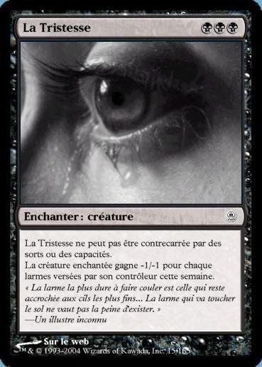 La capacité : Il est vrai qu'elle peut être très forte cette carte si on pleure beaucoup (lol) et en plus elle est incontrotable... mais il faut 3 manas noirs pour jouer cette carte (3 manas noirs pour bien montrer que la tristesse est un sentimentvraiment pas cool...) et ensuite la carte peut être aussi très faible si on ne pleure presque jamais...