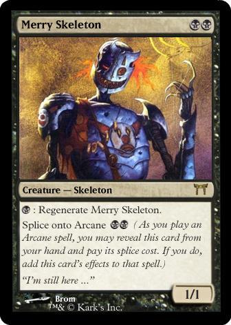 Mais ici c'est un peu spécial vu qu'on imprime pas un éphémère ou un rituel mais une CREATURE. En effet rien ne s'y oppose. On ajoute l'effet de la carte lorsque joue un arcane et pour 2 manas noir on obtient en plus un squelette régénérant.