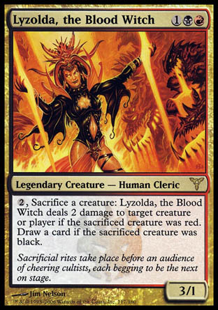 , Sacrifice a creature: Lyzolda, the Blood Witch deals 2 damage to target creature or player if the sacrificed creature was red. Draw a card if the sacrificed creature was black.
