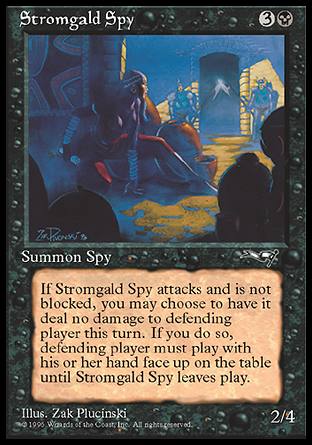 À chaque fois que l'Espionne de Stromgald attaque et n'est pas bloquée, vous pouvez faire que le joueur défenseur joue avec sa main révélée tant que l'Espionne de Stromgald reste sur le champ de bataille. Si vous faites ainsi, l'Espionne de Stromgald n'assigne aucune blessure de combat ce tour-ci.