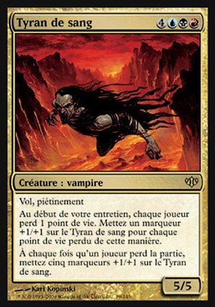 Au début de votre entretien chaque joueur perd 1 point de vie. Mettez un marqueur +1/+1 sur le Tyran de sang pour chaque point de vie perdu de cette manière.