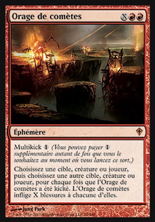 Choisissez une cible, créature ou joueur, puis choisissez une autre cible, créature ou joueur, pour chaque fois que l'Orage de comètes a été kické. L'Orage de comètes inflige X blessures à chacune d'elles.