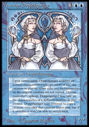 You may have Vesuvan Doppelganger enter the battlefield as a copy of any creature on the battlefield except it doesn't copy that creature's color and it gains "At the beginning of your upkeep, you may have this creature become a copy of target creature except it doesn't copy that creature's color. If you do, this creature gains this ability.".