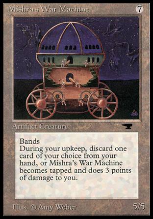 At the beginning of your upkeep, unless you discard a card, tap Mishra's War Machine and it deals 3 damage to you.