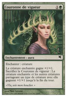 Sacrifiez la Couronne de vigueur : La créature enchantée et les autres créatures partageant un type de créature avec elle gagnent +1/+1 jusqu'à la fin du tour.