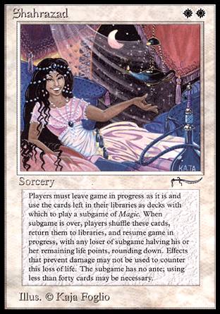 Players play a Magic subgame, using their libraries as their decks. Each player who doesn't win the subgame loses half his or her life, rounded up.