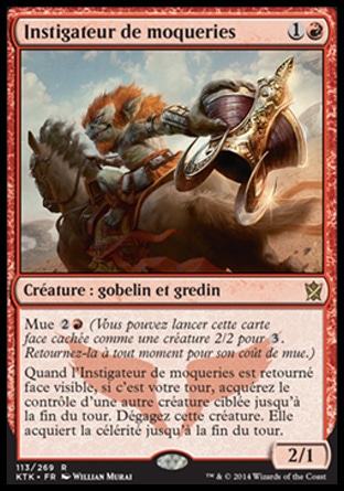 Quand l'Instigateur de moqueries est retourné face visible, si c'est votre tour, acquérez le contrôle d'une autre créature ciblée jusqu'à la fin du tour. Dégagez cette créature. Elle acquiert la célérité jusqu'à la fin du tour.
