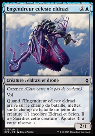 Quand l'Engendreur céleste eldrazi arrive sur le champ de bataille, mettez sur le champ de bataille un jeton de créature 1/1 incolore Eldrazi et Scion. Il a « Sacrifiez cette créature : Ajoutez