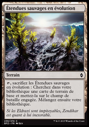 , sacrifiez les Étendues sauvages en évolution : Cherchez dans votre bibliothèque une carte de terrain de base et mettez-la sur le champ de bataille engagée. Mélangez ensuite votre bibliothèque.
