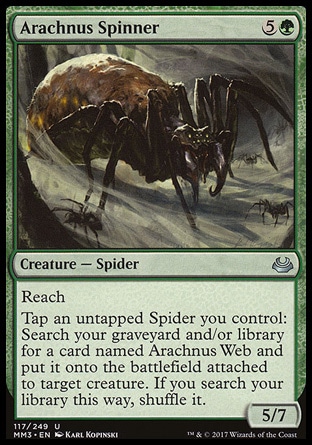 Engagez une Araignée dégagée que vous contrôlez : Cherchez dans votre cimetière et/ou votre bibliothèque une carte nommée Toile d'arachnus et mettez-la sur le champ de bataille attachée à la créature ciblée. Si vous avez cherché dans votre bibliothèque de cette manière, mélangez-la.