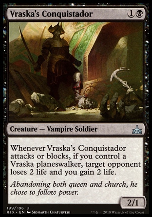 À chaque fois que Vraska's Conquistador attaque ou bloque, si vous contrôlez un planeswalker Vraska, l'adversaire ciblé perd 2 points de vie et vous gagnez 2 points de vie.