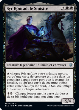 À chaque fois qu'une autre créature meurt, ou qu'une carte de créature est mise dans un cimetière depuis autre part que le champ de bataille, ou qu'une carte de créature quitte votre cimetière, Syr Konrad, le Sinistre inflige 1 blessures à chaque adversaire