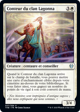 Quand le Conteur du clan Lagonna arrive sur le champ de bataille, vous pouvez mettre une carte d'enchantement ciblée depuis votre cimetière au-dessus de votre bibliothèque. Si vous faites ainsi, vous gagnez un nombre de points de vie égal à son coût converti de mana.