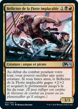 Au début du combat pendant votre tour, vous pouvez sacrifier une autre créature. Si vous faites ainsi, le Belliciste de la Flotte implacable gagne +2/+2 et acquiert le piétinement jusqu'à la fin du tour.