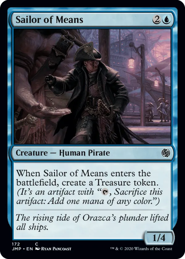 When Sailor of Means enters the battlefield, create a colorless Treasure artifact token with ", Sacrifice this artifact: Add one mana of any color to your mana pool.".