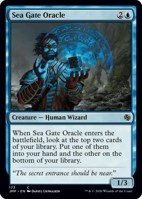 Quand l'Oracle de Porte des Mers arrive sur le champ de bataille, regardez les deux cartes du dessus de votre bibliothèque. Mettez l'une d'entre elles dans votre main et l'autre au-dessous de votre bibliothèque.