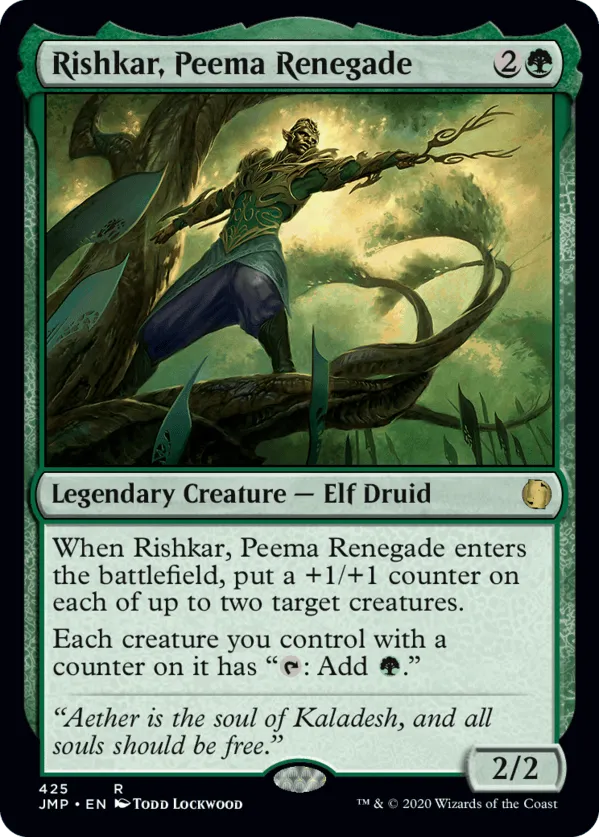 Quand Rishkar, renégat de Peema arrive sur le champ de bataille, ciblez jusqu'à deux créatures. Mettez un marqueur +1/+1 sur chacune d'elles.