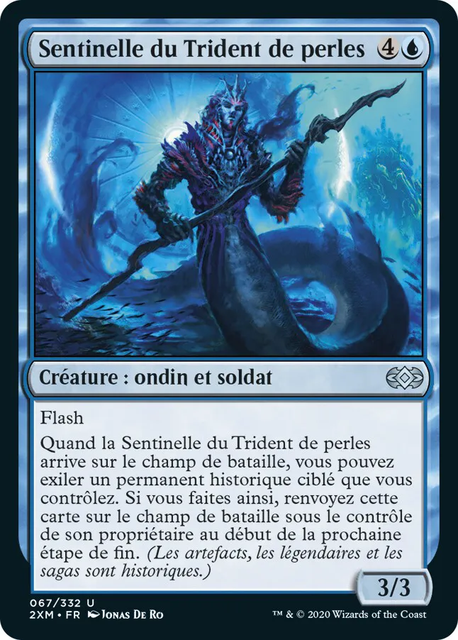 When Sentinel of the Pearl Trident enters the battlefield, you may exile target historic permanent you control. If you do, return that card to the battlefield under its owner's control at the beginning of the next end step. (Artifacts, legendaries, and Sagas are historic.).