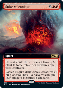 Ciblez jusqu'à deux cibles, créatures et/ou planeswalkers. La Salve volcanique leur inflige 6 blessures à chacune.
