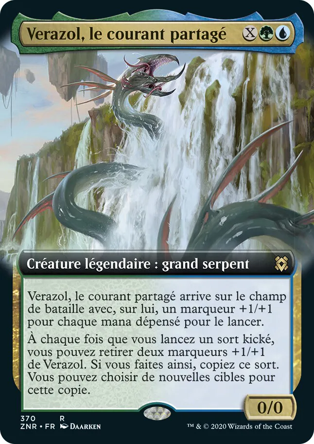 Verazol, le courant partagé arrive sur le champ de bataille avec, sur lui, un marqueur +1/+1 pour chaque mana dépensé pour le lancer.