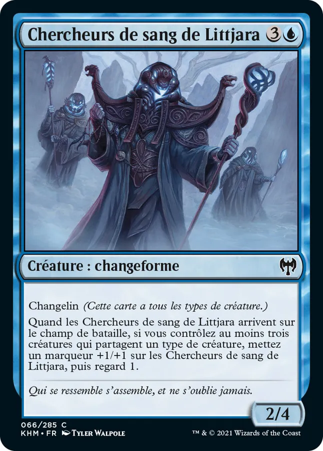 Quand les Chercheurs de sang de Littjara arrivent sur le champ de bataille, si vous contrôlez au moins trois créatures qui partagent un type de créature, mettez un marqueur +1/+1 sur les Chercheurs de sang de Littjara, puis regard