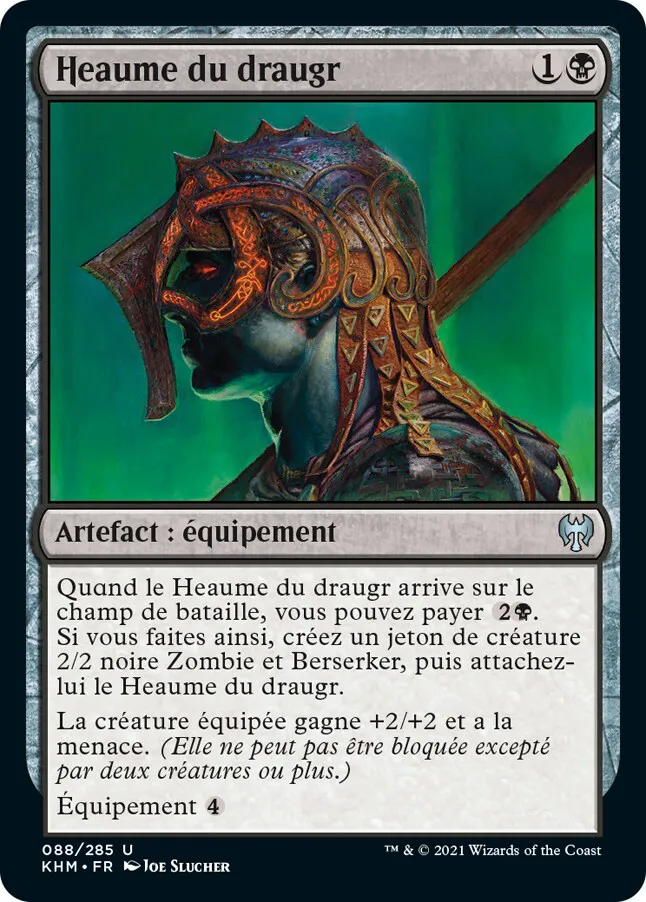 . Si vous faites ainsi, créez un jeton de créature 2/2 noire Zombie et Berserker, puis attachez-lui le Heaume du draugr.