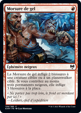 La Morsure de gel inflige 2 blessures à une créature ciblée ou à un planeswalker ciblé. Si vous contrôlez au moins trois permanents neigeux, elle inflige 3 blessures à la place.
