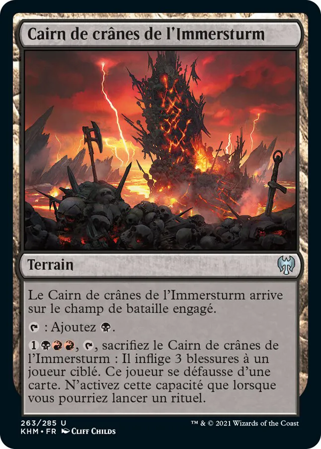 , sacrifiez le Cairn de crânes de l'Immersturm : Il inflige 3 blessures à un joueur ciblé. Ce joueur se défausse d'une carte. N'activez cette capacité que lorsque vous pourriez lancer un rituel.