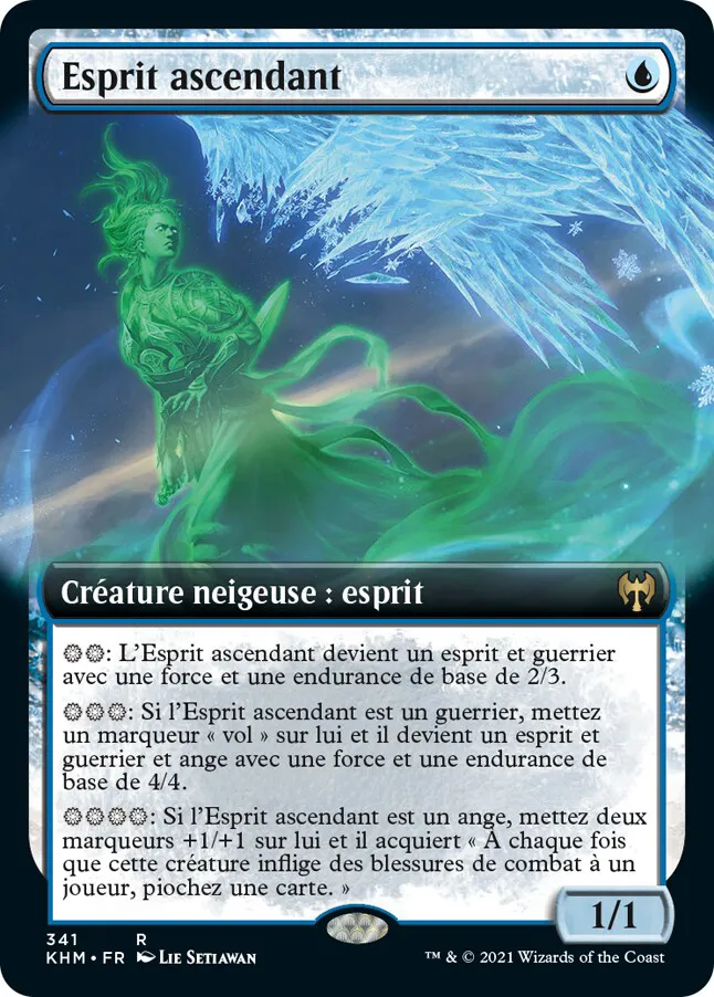 : Si l'Esprit ascendant est un ange, mettez deux marqueurs +1/+1 sur lui et il acquiert "À chaque fois que cette créature inflige des blessures de combat à un joueur, piochez une carte.".