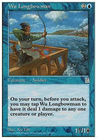 : Wu Longbowman deals 1 damage to target creature or player. Activate this ability only during your turn, before attackers are declared.
