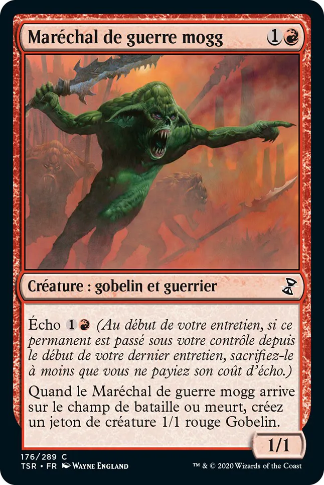 Quand le Maréchal de guerre mogg arrive sur le champ de bataille ou meurt, créez un jeton de créature 1/1 rouge Gobelin.