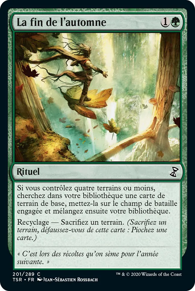 Si vous contrôlez quatre terrains ou moins, cherchez dans votre bibliothèque une carte de terrain de base, mettez-la sur le champ de bataille engagée et mélangez ensuite votre bibliothèque.