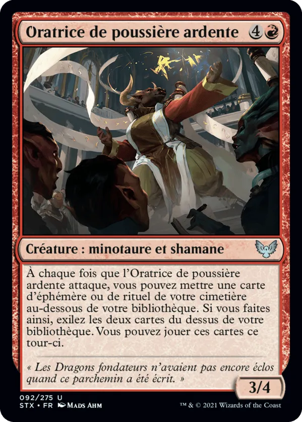 À chaque fois que Ardent Dustspeaker attaque, vous pouvez mettre une carte d'éphémère ou de rituel depuis votre cimetière au-dessous de votre bibliothèque. Si vous faites ainsi, exilez les deux cartes du dessus de votre bibliothèque. Jusqu'à la fin du tour, vous pouvez jouer ces cartes.