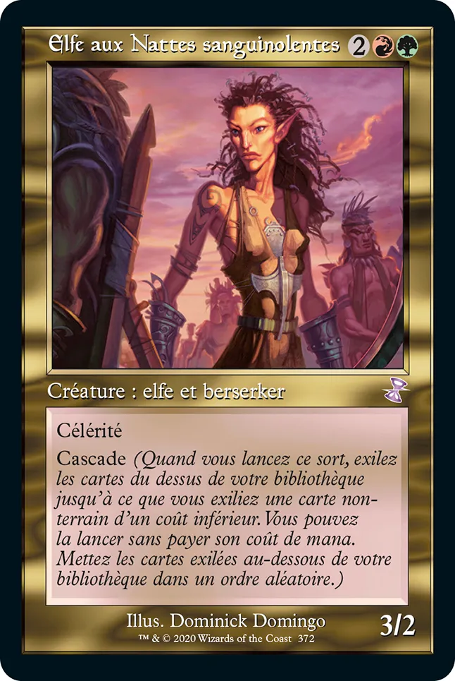 Cascade (Quand vous lancez ce sort, exilez les cartes du dessus de votre bibliothèque jusqu'à ce que vous exiliez une carte non-terrain d'un coût inférieur. Vous pouvez la lancer sans payer son coût de mana. Mettez les cartes exilées au-dessous de la bibliothèque dans un ordre aléatoire.).