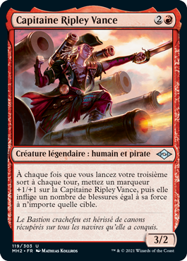 À chaque fois que vous lancez votre troisième sort à chaque tour, mettez un marqueur +1/+1 sur la Capitaine Ripley Vance, puis elle inflige un nombre de blessures égal à sa force à n'importe quelle cible.